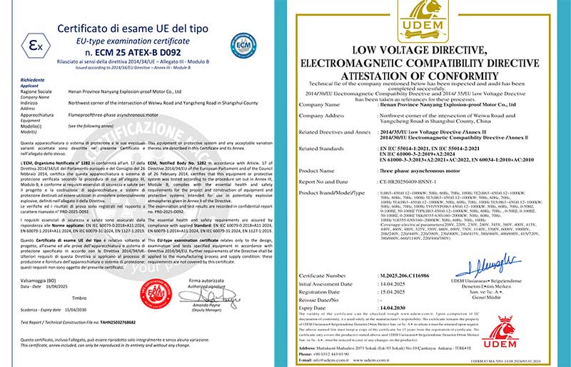 近日,河南省南洋防爆電機有限公司傳來喜訊:公司自主研發(fā)生產(chǎn)的防爆電機產(chǎn)品,順利通過權(quán)威機構(gòu)的嚴格檢測與審核,正式獲得CE認證證書與ECM 25 ATEX-B D092證書。這兩項國際權(quán)威認證的取得,不僅標志著南洋防爆電機的產(chǎn)品質(zhì)量、安全性能達到了國際標準,也為企業(yè)進一步拓展海外市場奠定了堅實基礎。